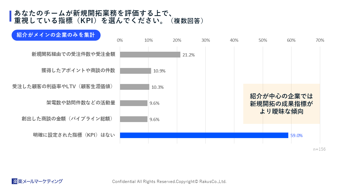 また新規開拓を「紹介」に頼る企業では、「明確に設定された指標(KPI)はない」と回答した割合は59.0%だった。「紹介」という受動的な手法への依存が、営業活動を管理・評価する仕組みの導入を遅らせる一因となっている可能性が考えられる。