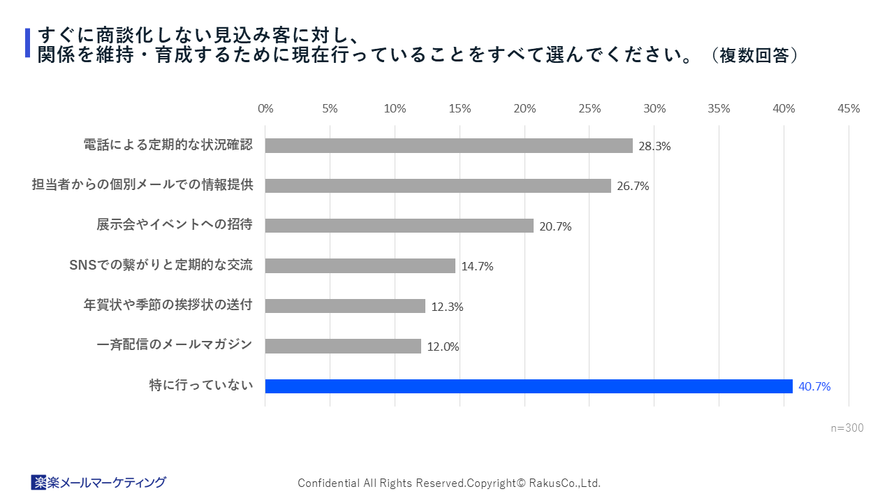 その一方で、すぐに商談化しない見込み客に対する継続的なアプローチについて、40.7%が「特に行っていない」と回答した。