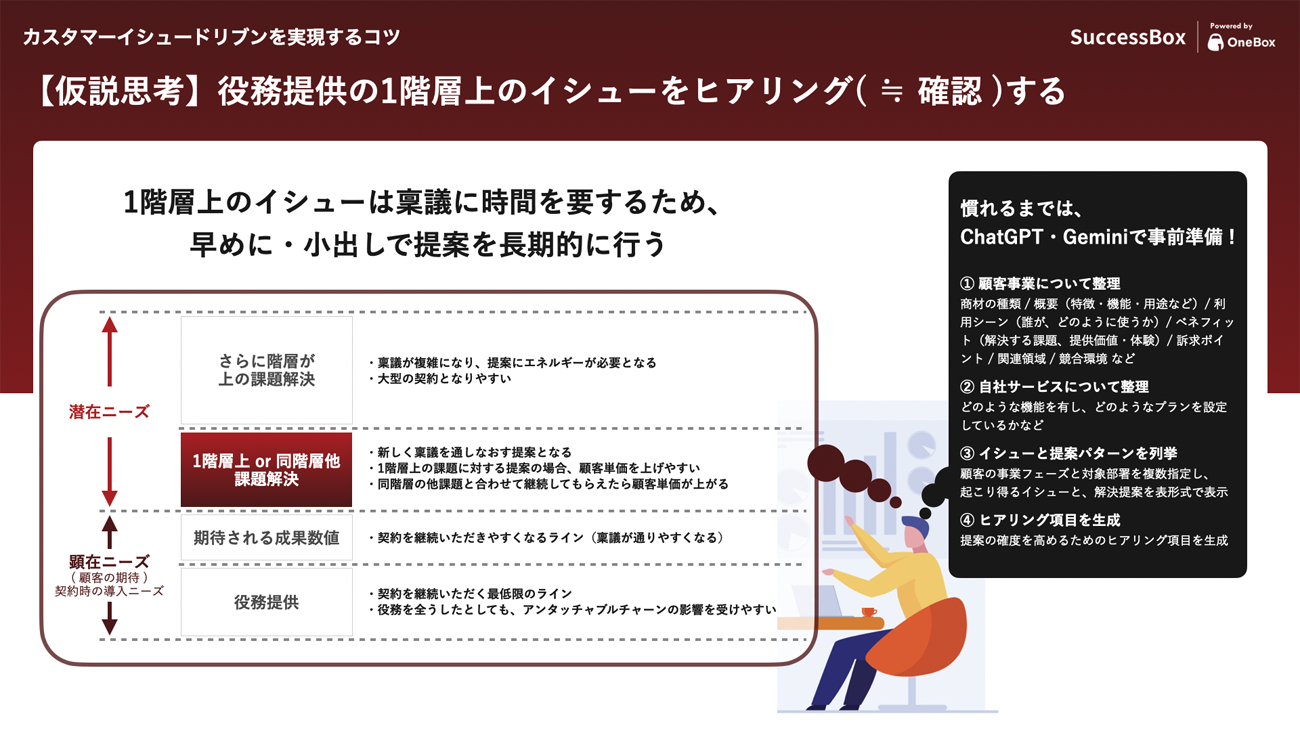 当然、提案の仮説づくりには膨大なリソースを消費する。そこで活用したいのが生成AIだ。SuccessBoxではChatGPTを使った「カスタマーイシュー生成GPT」を作成し、活用している。