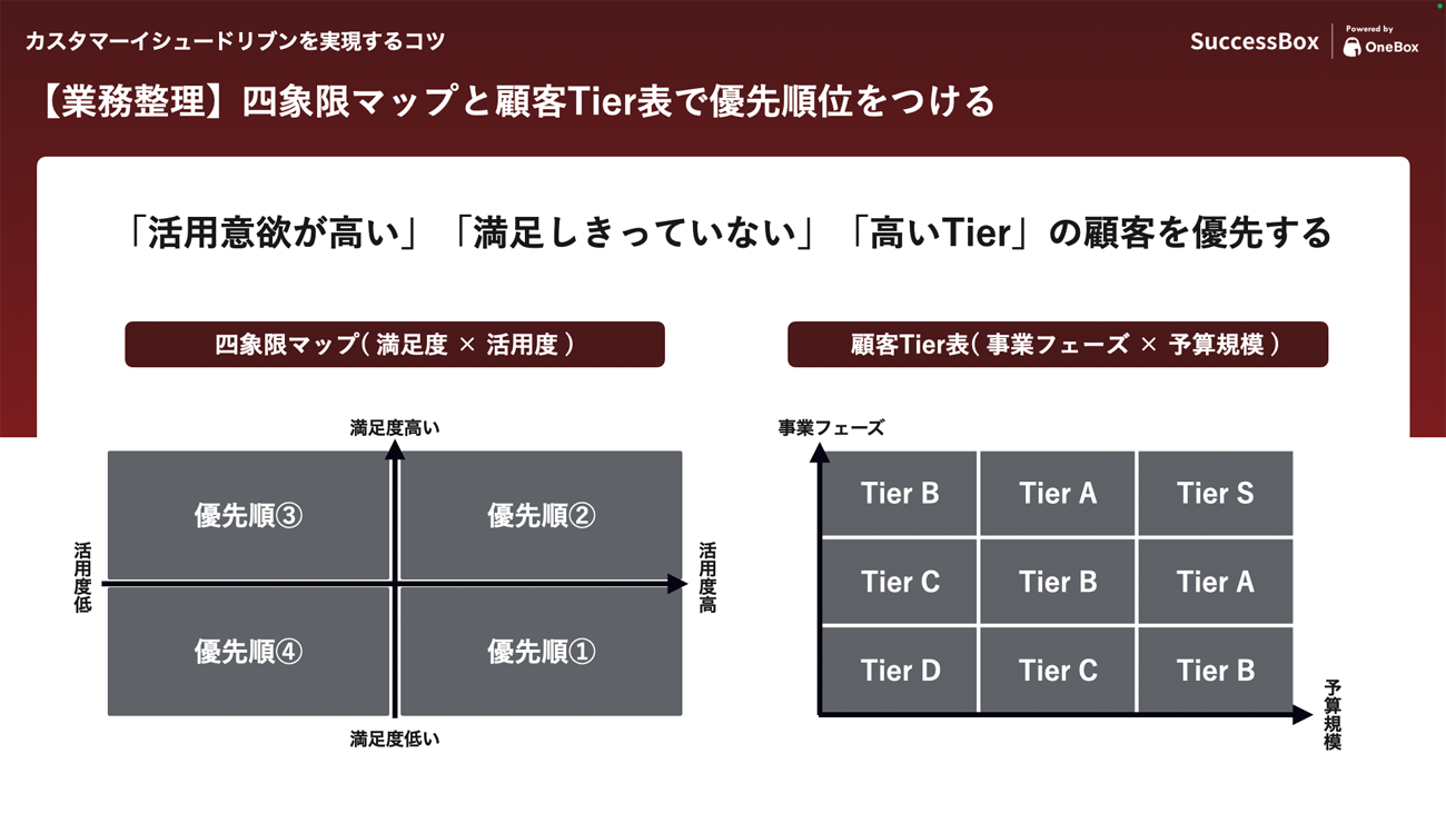 課題解決の助言や提言を誰に行うか優先順位を決める際に活用しているのが、提案すべき顧客を絞り込む「四象限マップ」と、CS対応のしやすさをマッピングした「顧客Tier表」だ。