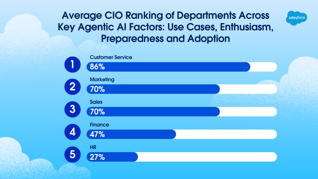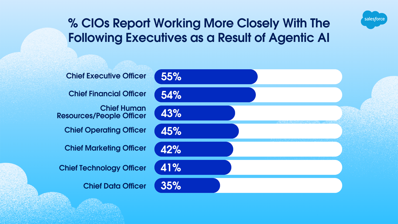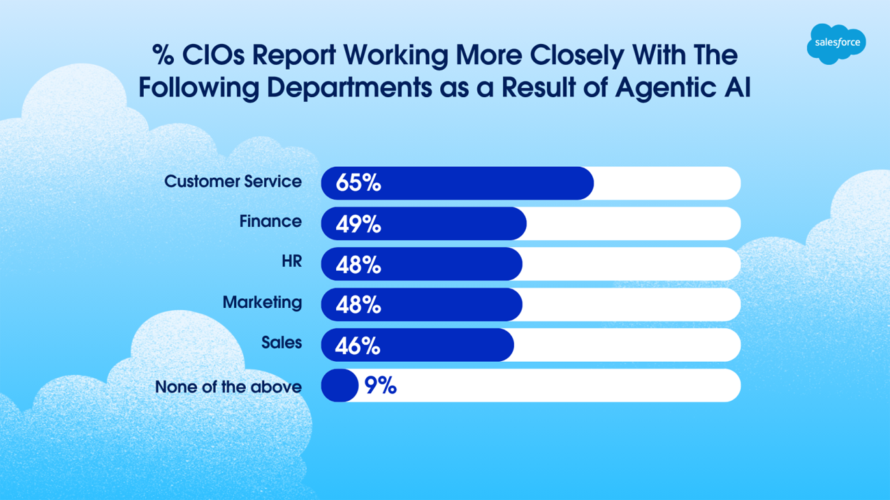 - CIOの65%が、自律型AIの導入により顧客サービス部門とこれまで以上に緊密に連携していると回答しており、これはほかのどの部門よりも高い割合だった。
