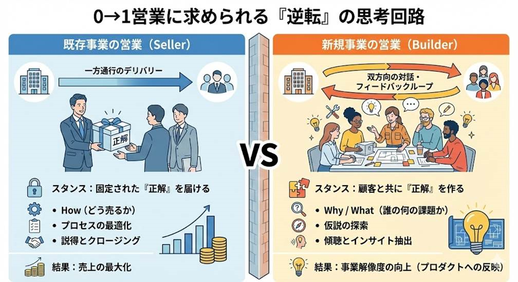 一方で、新規事業の0→1営業に求められるのは、「Why(なぜ顧客は買うのか)」「What(何を価値として提供すべきか)」といった問いを自ら設定し、市場との対話を通じて事業仮説そのものを構築していく「探索のプロフェッショナル」としてのケイパビリティです。