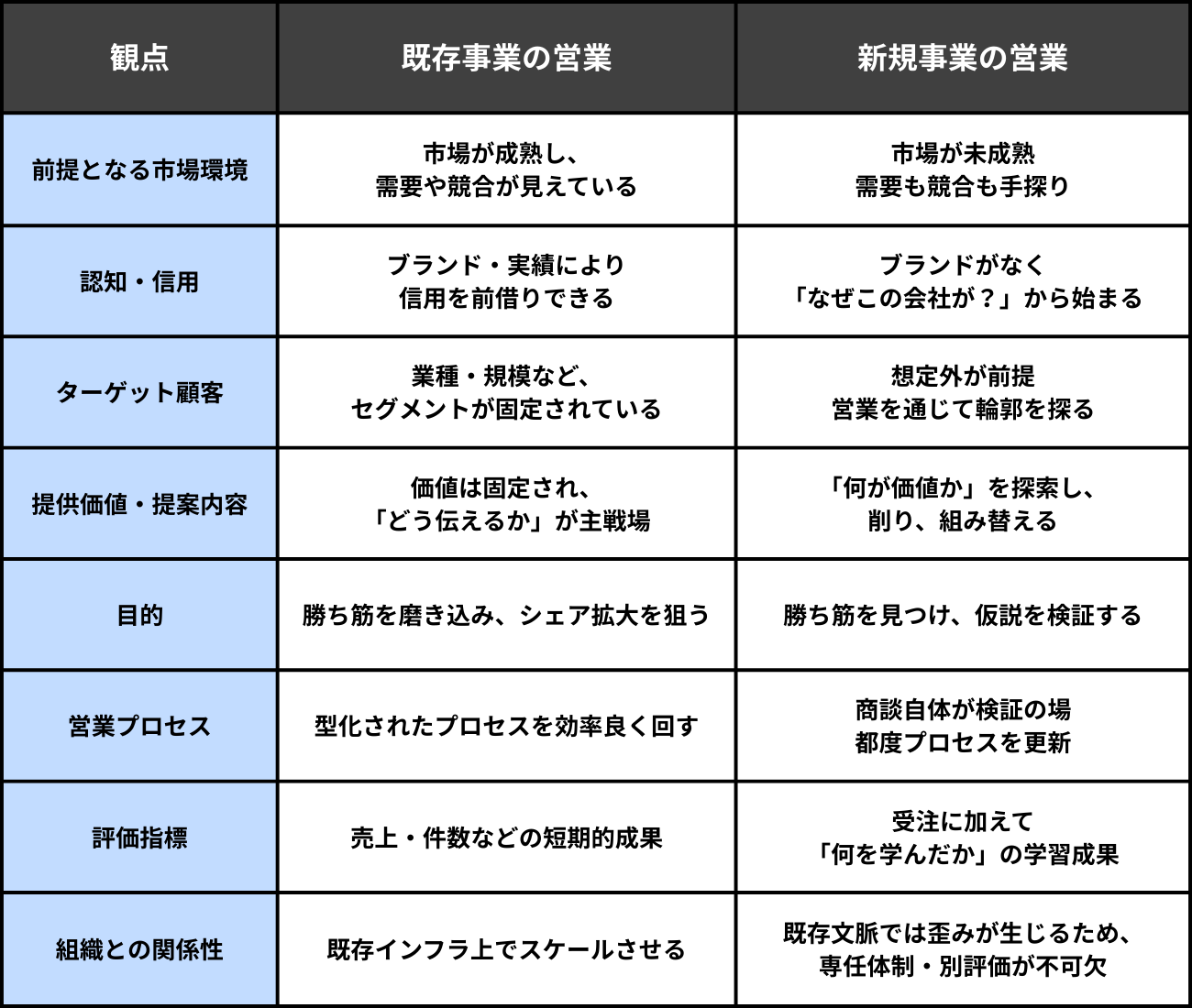 新規事業の営業を考えるうえで、まず押さえておきたいのは、既存事業の営業と同じ発想・同じ組織・同じ評価軸では、ほぼ確実にうまくいかないということです。ここで言う違いは、単に売る対象のプロダクトが新しいかどうかというレベルではなく、営業が立っている土台そのものが大きく異なっています。