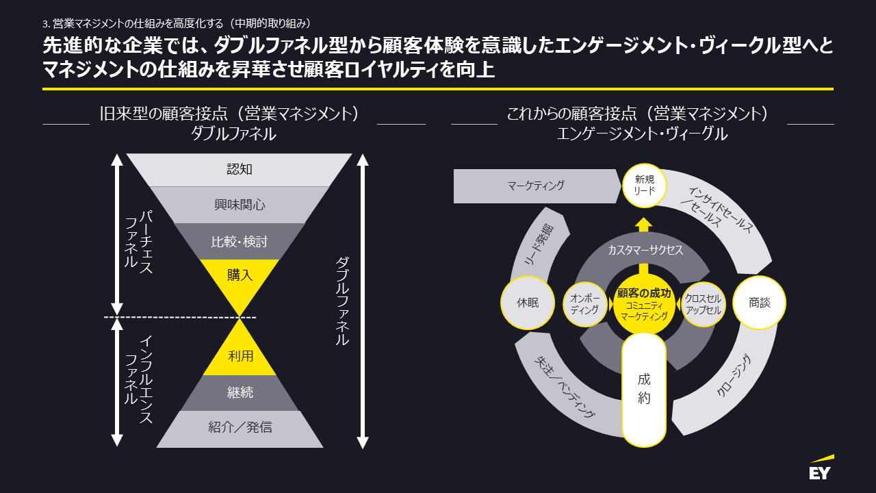 これからの時代は、「エンゲージメント・ヴィークル」型のマネジメントサイクルへの転換が求められます。これは、カスタマーサクセスやマーケティングを含む一連の顧客接点組織・機能全体を、継続的なサイクルとしてマネジメントするという考え方です。