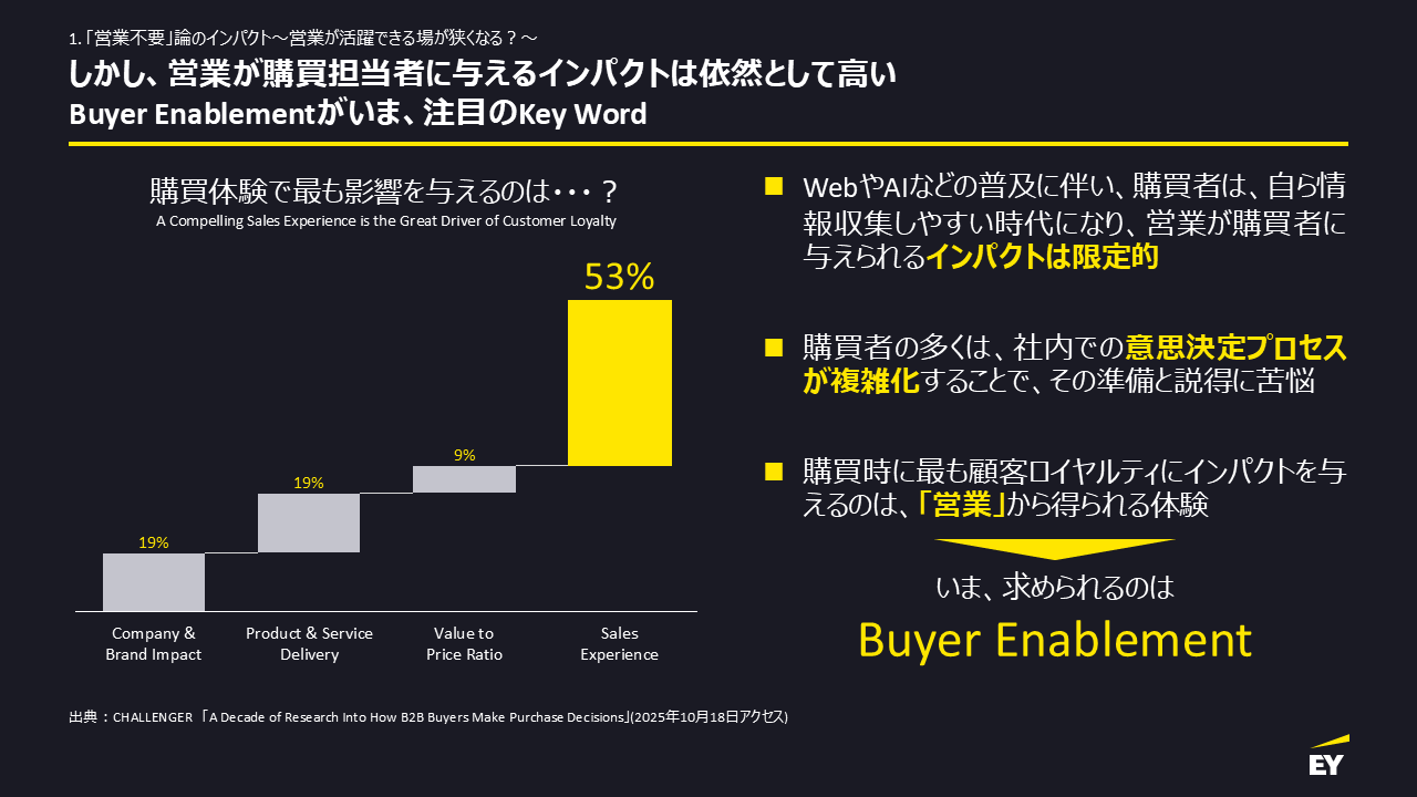 背景にあるのは、ウェブやAIの普及による情報のオープン化です。顧客は営業に頼らずとも自ら情報を収集し、比較検討を進められるようになりました。