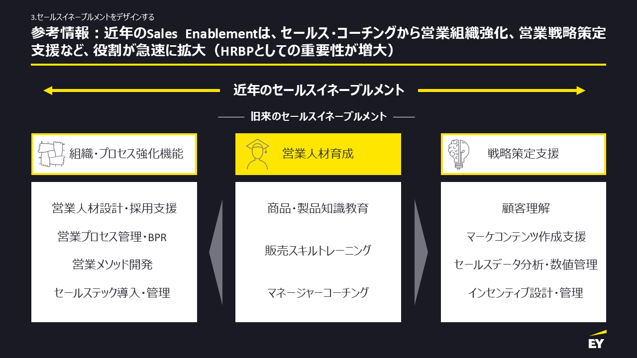 一般的に、セールスイネーブルメントは、商品知識のトレーニングやセールススキルのコーチングなど「営業人材の育成」という文脈で語られがちです。しかし、近年は、戦略策定や組織・プロセス強化にも深く入り込むことが求められています。