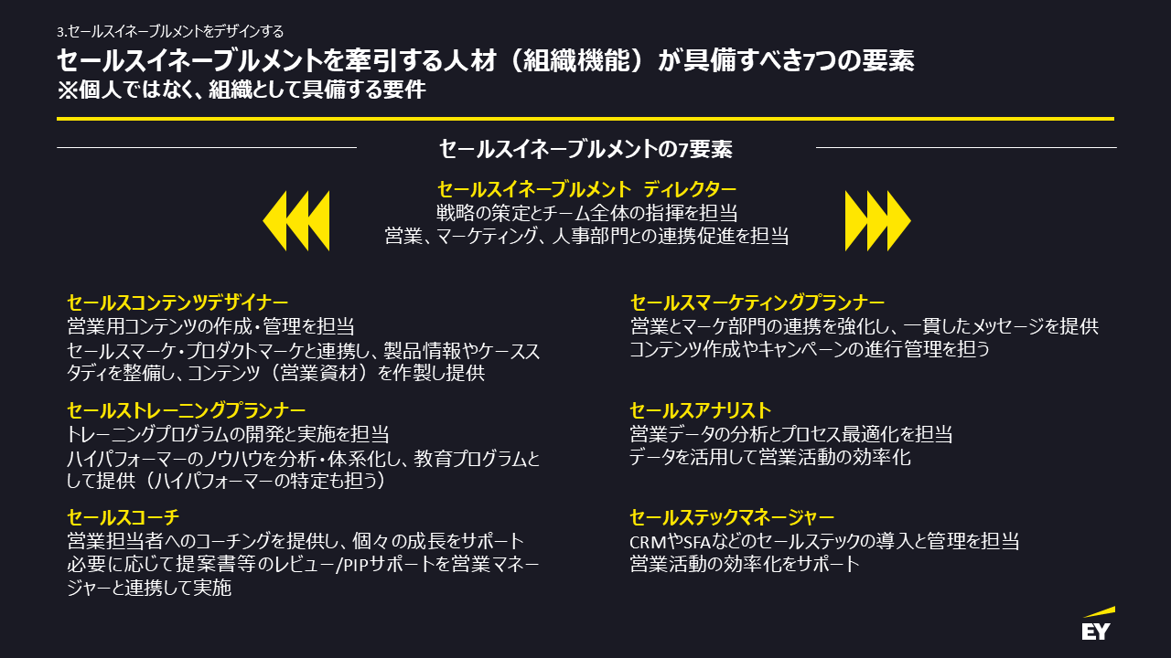 ほかにも、営業用コンテンツを磨きあげる「コンテンツデザイナー」、ハイパフォーマーの特定からトレーニングプログラムの設計を担う「セールストレーニングプランナー」、現場の営業マネージャーと連携して伴走支援を担う「セールスコーチ」など、どれかひとつでも欠けてしまうと、仕組みとして機能しなくなります。