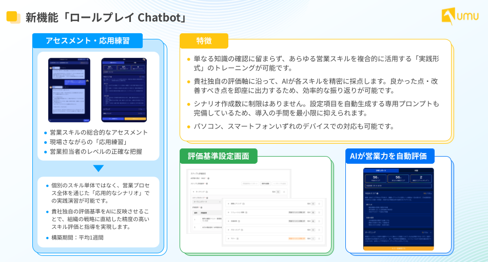 今回発表したUMU AIロープレは、新機能「ロールプレイ Chatbot」を搭載し、インプットとアウトプットを統合して成果が出るまでやり抜くためのプラットフォーム。特徴は次のとおり。