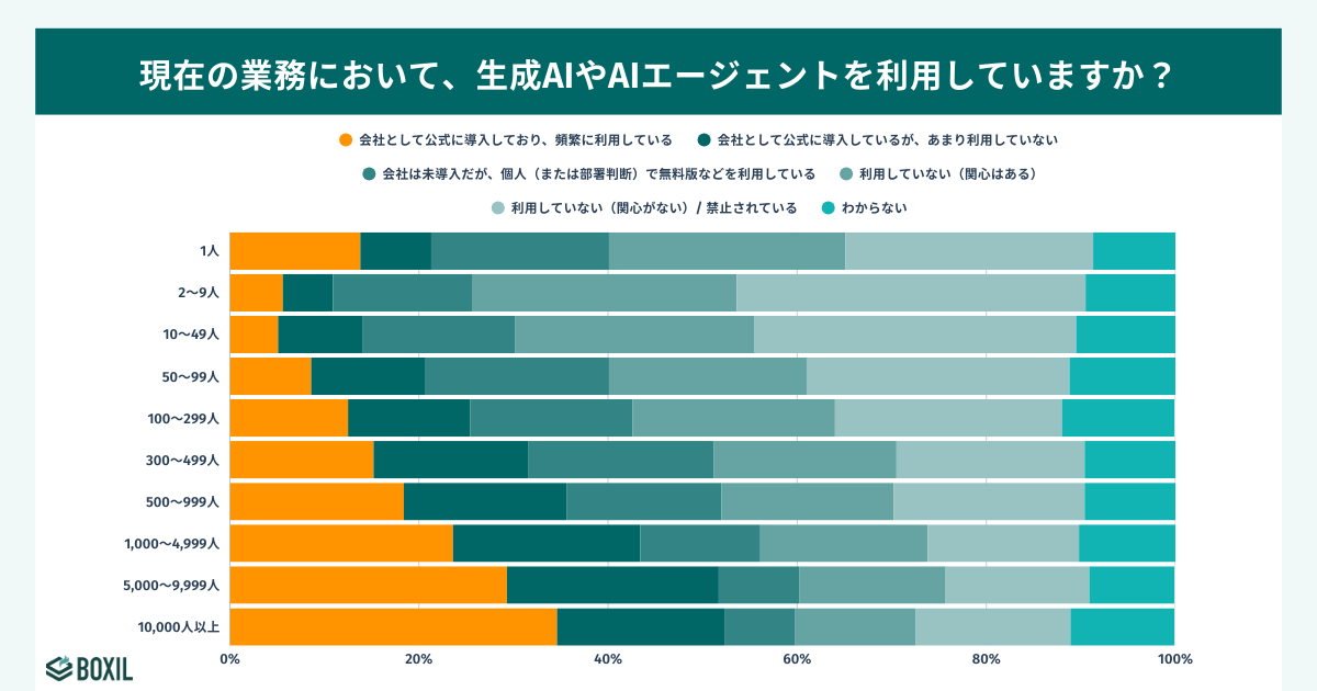 生成AIやAIエージェントの導入状況を企業規模別に見ると、従業員1万人以上の大企業では52.3%に達しており、2社に1社が生成AI組織的な導入を完了させている。一方、小規模企業(10〜49人)では、公式導入率(14.0%)を個人利用(16.2%)が上回っており、環境が整備されないまま、現場のニーズが先行する「シャドーAI」が進んでいる実態が明らかになった。