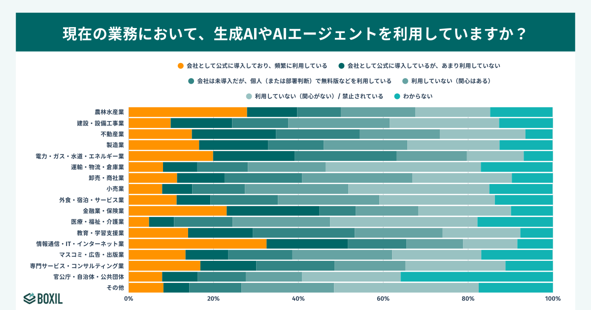 業種別では「情報通信・IT」(51.7%)、「金融・保険」(44.9%)が先行している。一方で、公式導入が極めて遅れているのが「医療・福祉・介護業」(10.7%)や「官公庁・自治体」(16.3%)である。