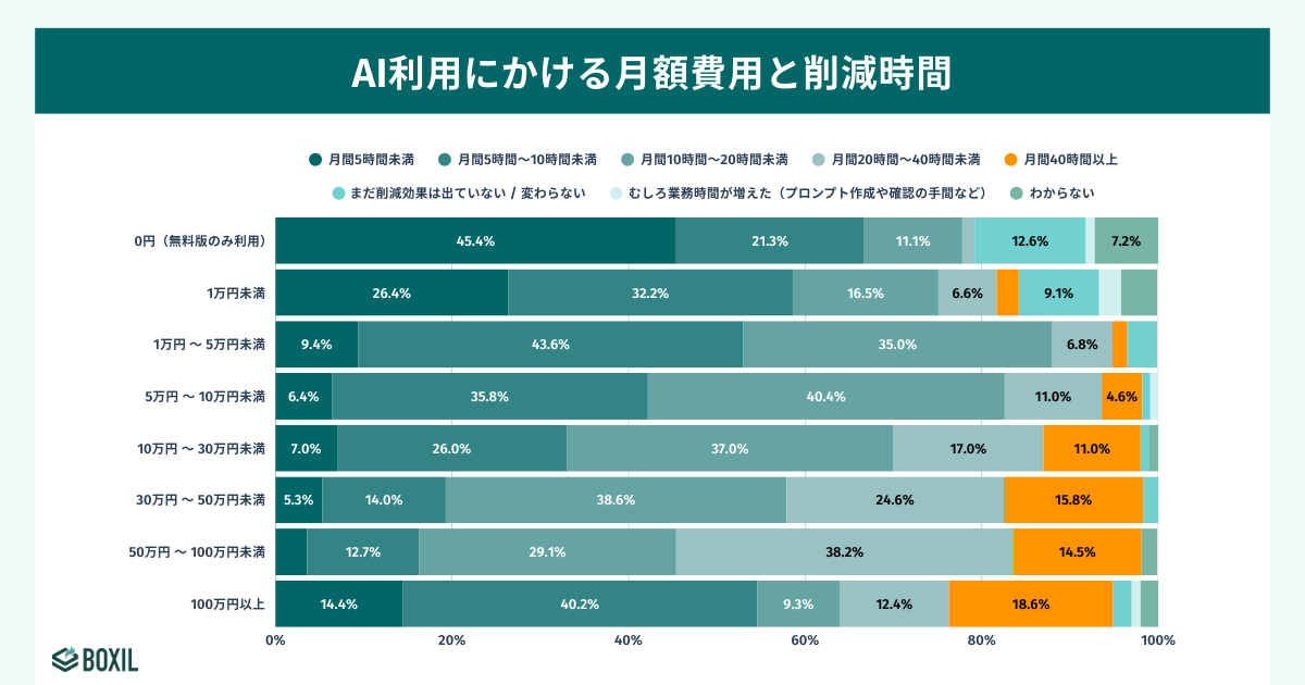 AI利用にかける月額費用と削減時間を分析したところ、費用0円(無料版のみ)の層で月40時間以上の削減に成功した人は0.0%だった。無料版利用者の45.4%は、月5時間未満のわずかな削減に留まっている。