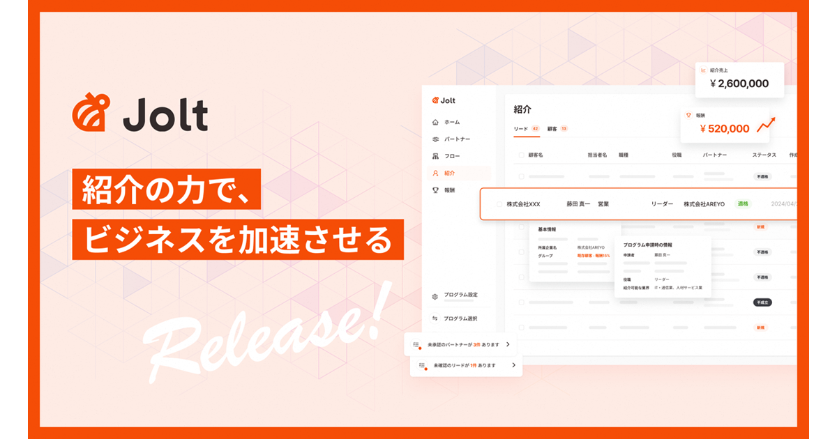 AREYOは、紹介によるリード獲得を仕組み化するリファラルマーケティングSaaS「Jolt(ジョルト)」の提供を開始した。