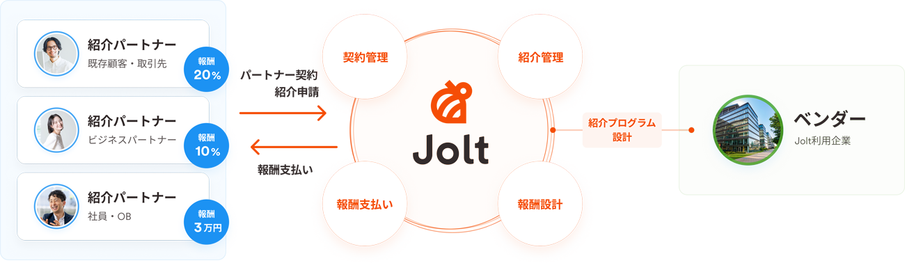 Joltは、BtoB企業の紹介プログラム(※2)を一元管理し、紹介パートナー契約、紹介管理、報酬設計から報酬支払いまでを自動化するプラットフォーム。専用の紹介用URLを活用することで、従来の依頼を起点とする手法から、日常的な情報共有に近い形態へと移行させる。