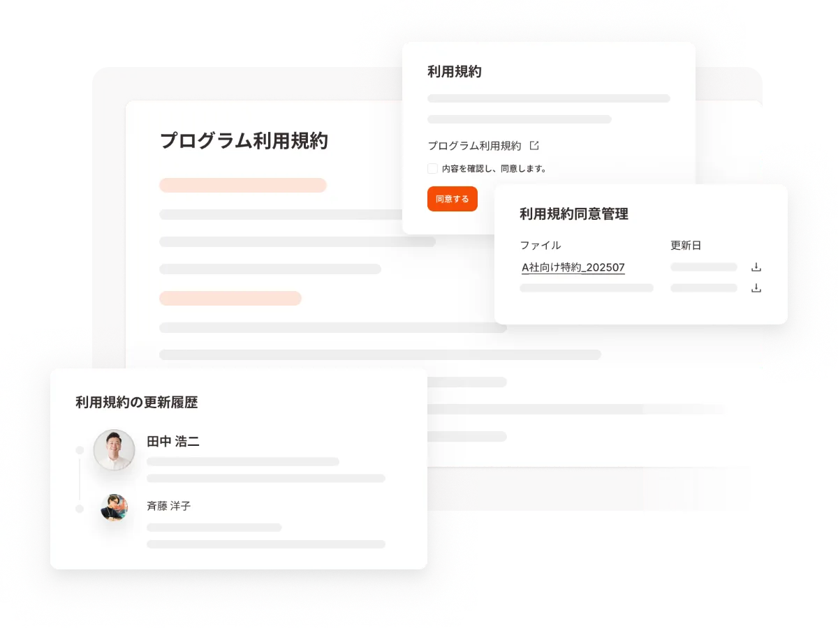 プログラム利用規約の同意取得、管理、個別条件の設定を一括で自動化する。これにより、紹介パートナーとの契約締結に関わる一連の手続きを、システム上で完結できる。