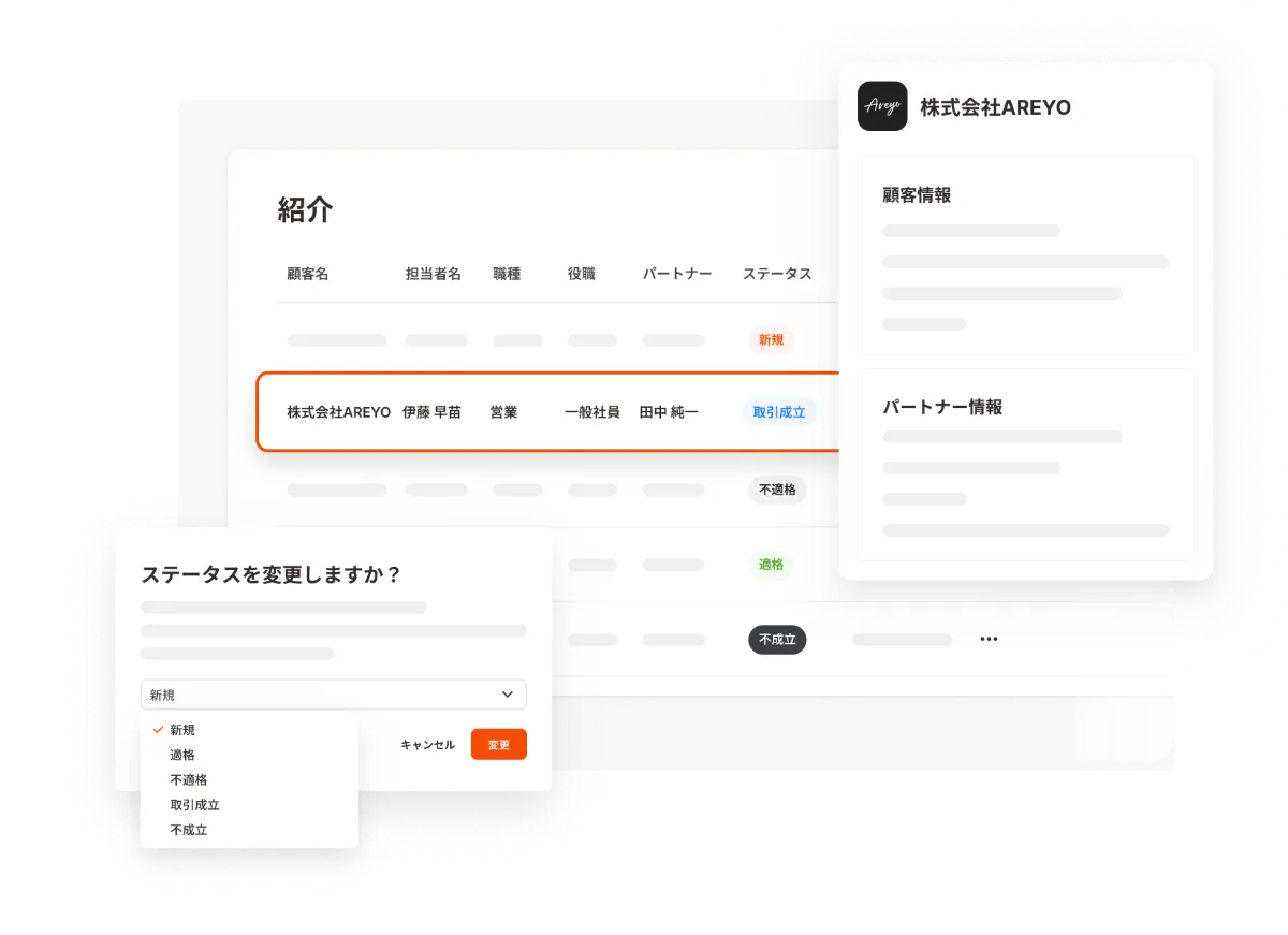 誰が誰を紹介したのかを法人・個人を問わず一元管理。進捗・成果・ステータスを可視化し、紹介活動全体を把握できる。