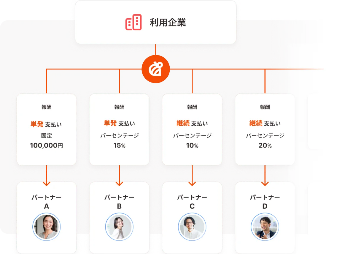 ステップアップ報酬や二段階報酬、初回特典など、目的に応じた柔軟な設計が可能。紹介者のモチベーションを維持し、継続的な紹介を促進する。