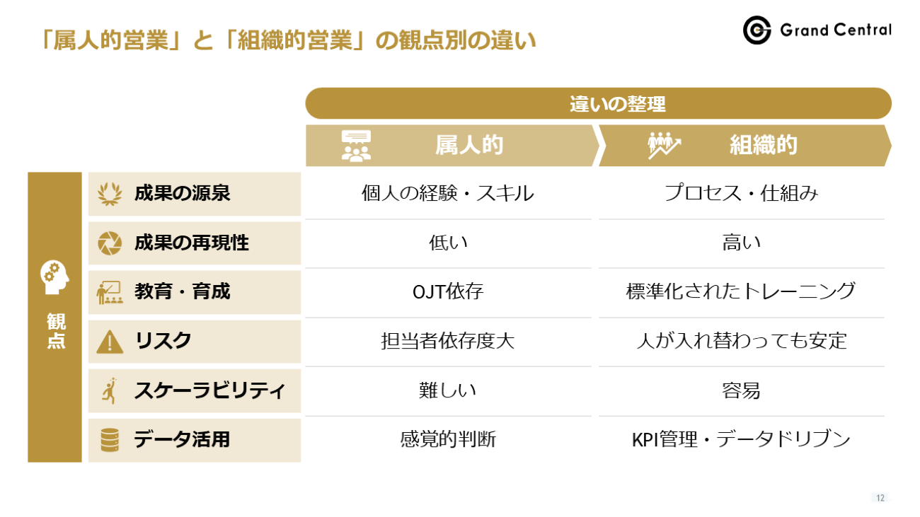「属人化」という言葉は、現代の営業組織において「悪」と断じられがちだ。しかし、明石氏はまず、「属人化営業」と「組織営業」、それぞれの功罪を冷静に分析することから議論を始める。