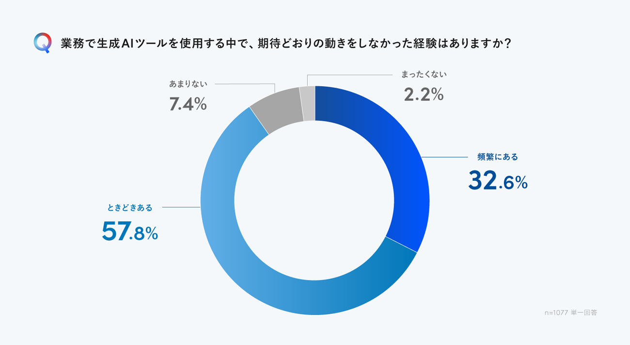 業務で生成AIツールを利用する際、期待どおりの動きをしなかった経験があると回答した割合は「頻繁にある」(32.6%)、「ときどきある」(57.8%)を合わせると90.4%にのぼった。