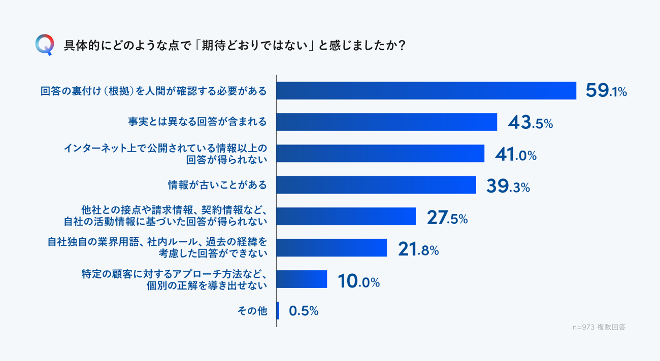 そう感じた理由として、「回答の裏付けを人間が確認する必要がある」(59.1%)、「事実とは異なる回答が含まれる」(43.5%)、「インターネット上で公開されている情報以上の回答が得られない」(41.0%)が上位となった。また、「情報が古いことがある」(39.3%)、「他社との接点や請求、契約情報など、自社の活動情報に基づいた回答が得られない」(27.5%)と続いた。