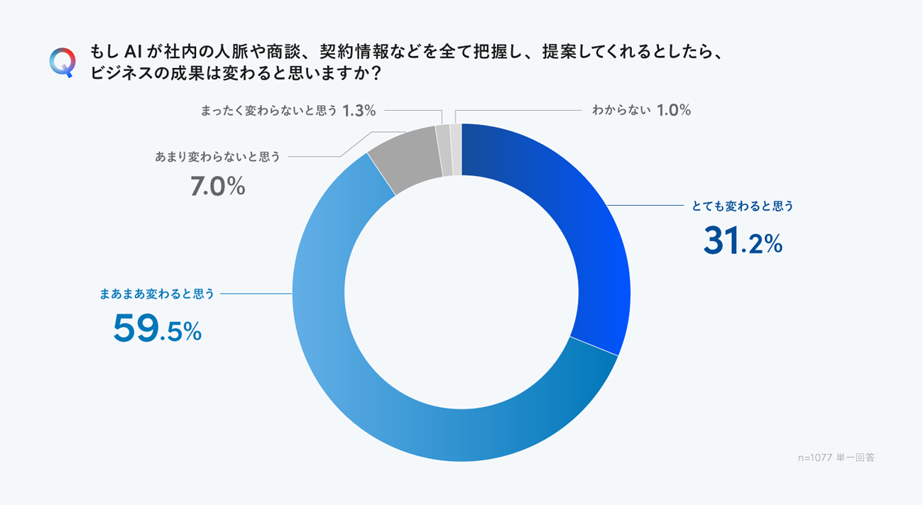 「AIが社内の人脈や商談情報を把握すれば、ビジネスの成果が変わると思うか」との問いには、合わせて90.7%が「とても変わると思う」「まあまあ変わると思う」と回答。