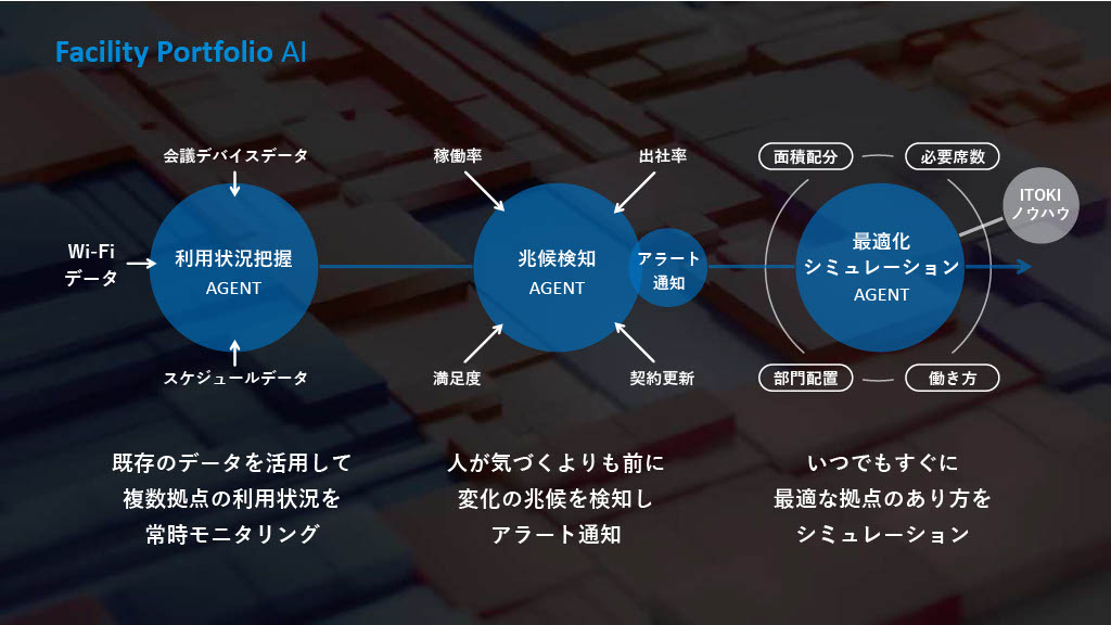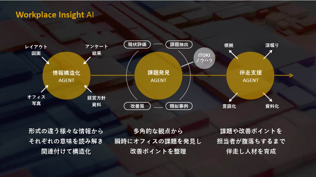 こうした背景からイトーキは、「High-cycle/AI」を実現する「ITOKI OFFICE AI AGENTS」を開発。2026年には3つのソリューションをリリースすると発表した。