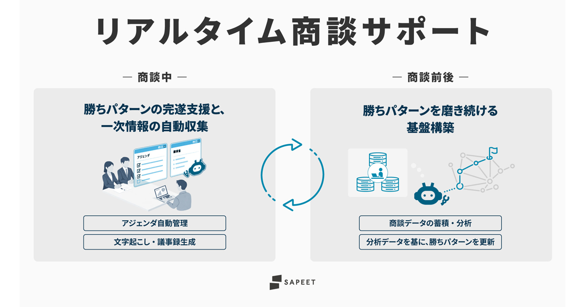 こうした背景から、Sapeetは、AIが商談に同席して組織の勝ちパターンの実行を支援する「リアルタイム商談サポート」の提供に至った。