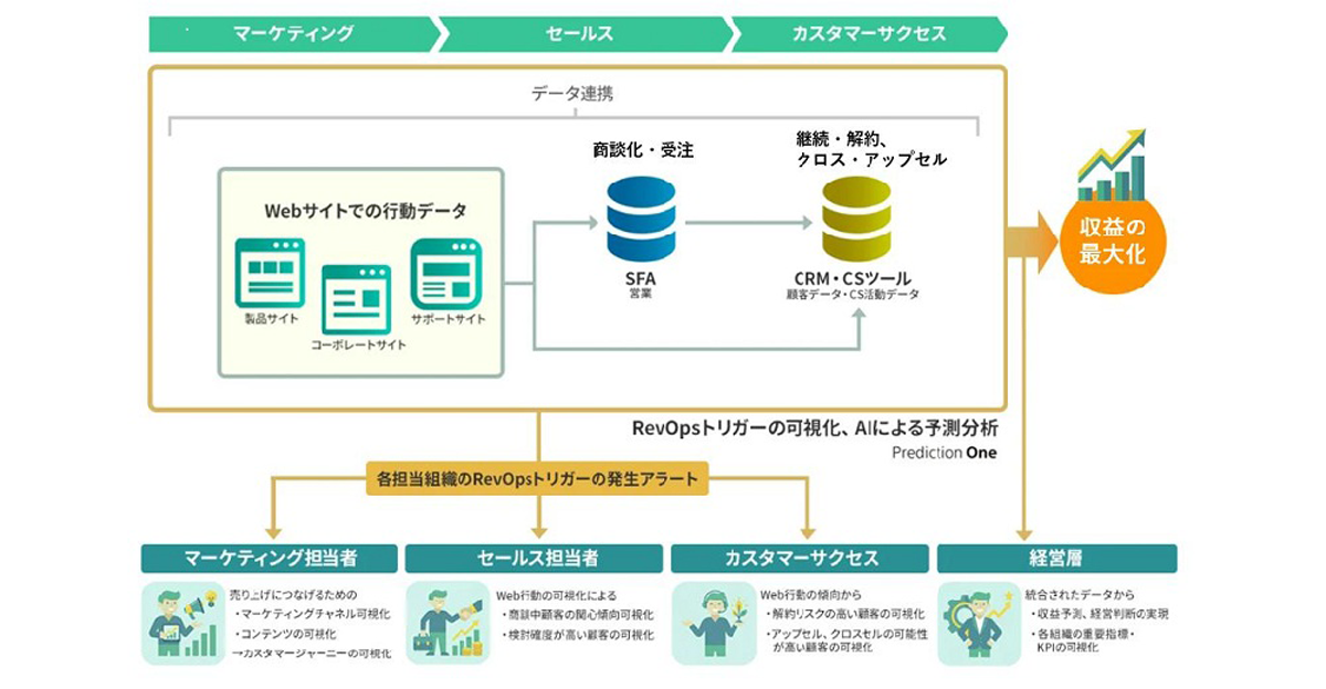BtoB企業の分断されたマーケティング・営業・カスタマーサクセスのデータを連携し、AIによって、各組織における収益の最大化に貢献するトリガー指標(RevOpsトリガー)を可視化、収益予測を実現する。これにより、収益の最大化に向けて各組織が連動したKPI設計、プロセス設計が可能になり、組織全体で一貫した収益プロセスを作る仕組みを構築。BtoB企業の収益の最大化、データドリブンなRevOpsの基盤の構築・運用を目指す。