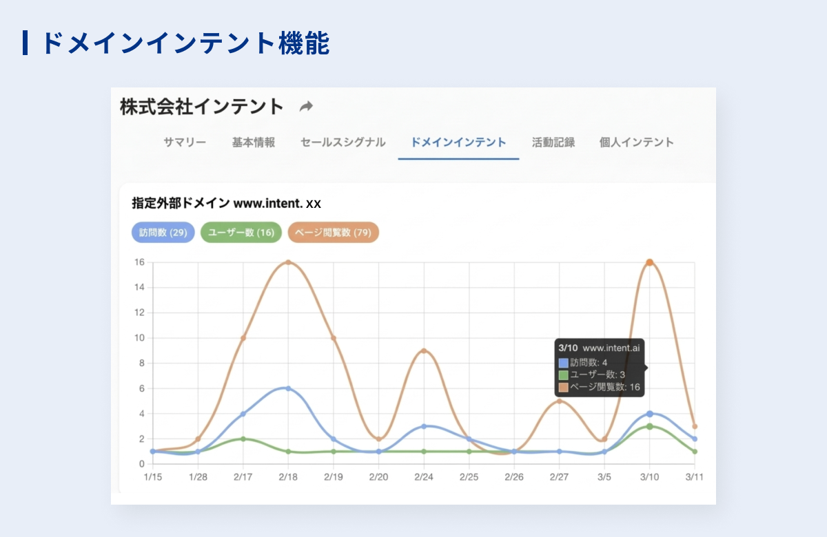 本機能は、単なるドメイン閲覧分析を目的としたものではなく、指定ドメイン上のシグナルを顧客理解の新しいレイヤーとして活用することで、比較検討フェーズを多角的に分析し、営業・マーケティング活動における判断材料を拡充する。