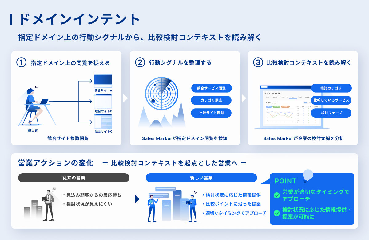 営業・マーケティング支援SaaS「SalesMarker(セールスマーカー)」を開発・提供するSales Markerは、企業が指定した外部ドメイン上のシグナルを活用する新機能「ドメインインテント」の提供を開始した。