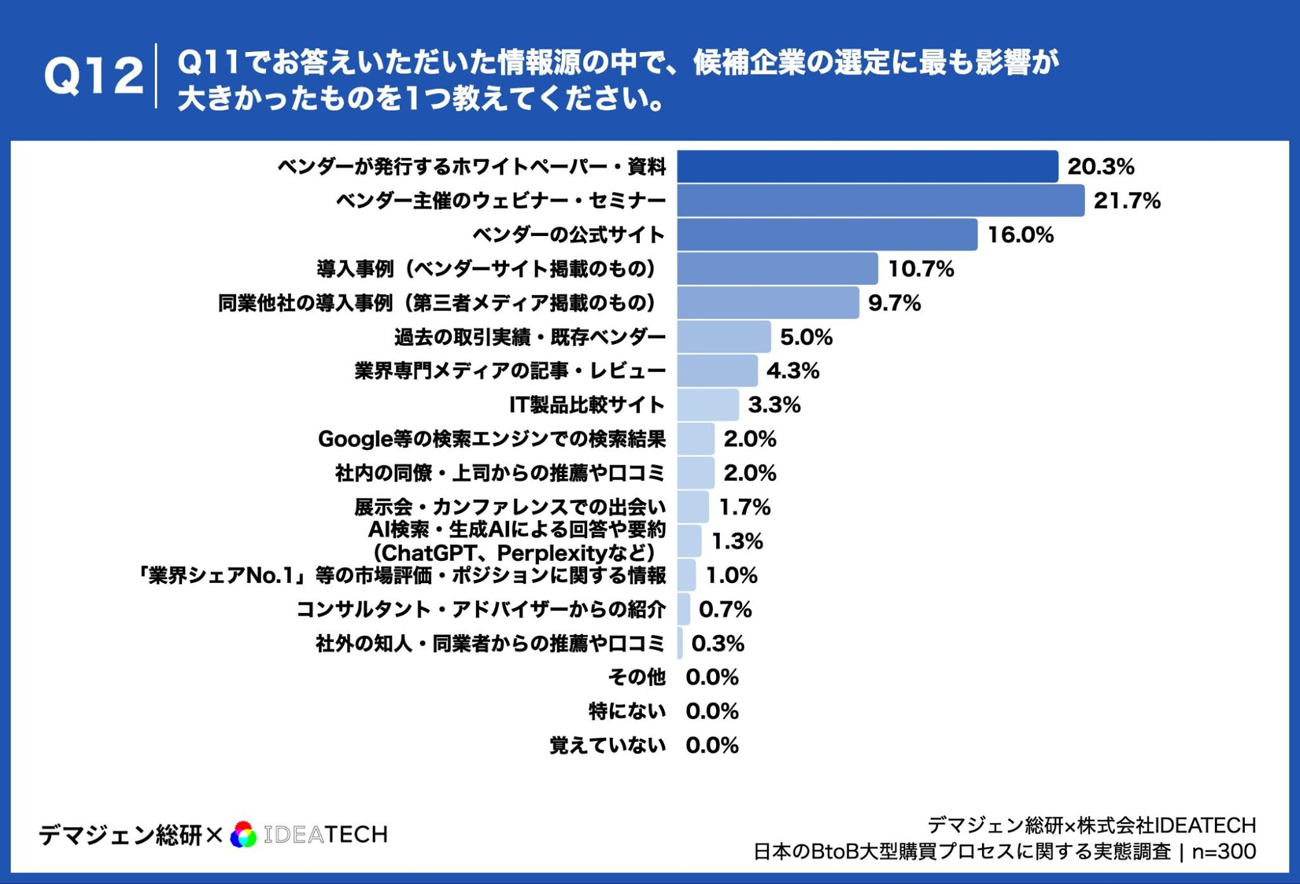 参考にした情報源の中で、もっとも影響があった情報源も同様に、「ベンダーが発行するホワイトペーパー」「主催するウェビナー・セミナー」「ベンダーの公式サイト」「導入事例」という結果になりました。