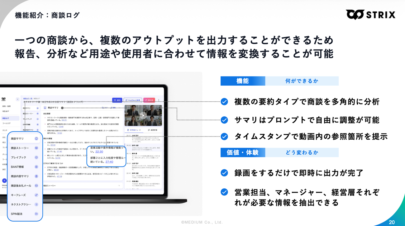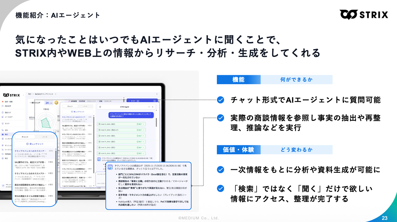 MEDIUMは、商談の一次情報を自動で蓄積・構造化する「STRIX(ストリクス)」について、セールスデータプラットフォームとして提供を強化することを発表した。