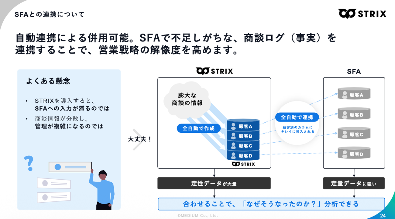 多くの企業で、顧客が抱く懸念点や競合他社との具体的な比較軸、組織内の意思決定ルートといった情報は属人化しており、組織として利用可能な形で構造化されていない。このような背景からMEDIUMは、セールスデータプラットフォームとしてSTRIXの提供を強化した。