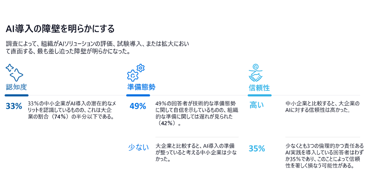 - 信頼性の向上が必要:透明性対策や定期的なリスク評価など、責任あるAI実践を3項目以上導入している企業はわずか35%にとどまる。