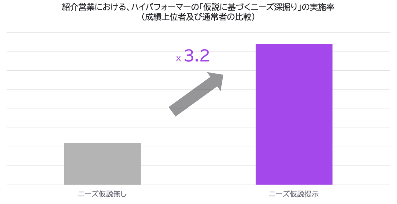 Bring Outを導入している人材業界における商談データを解析した結果、トップ営業職は成績下位営業職より、過去の商談を振り返りつつ仮説に基づくニーズの深掘りを実施している割合が3.2倍であることが判明した。