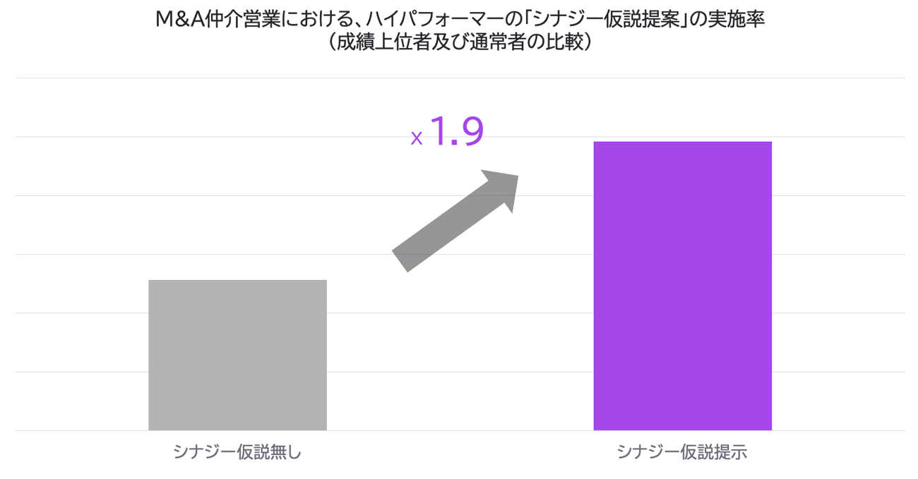 Bring Outを導入しているM&A業界の企業における商談データ解析の結果、顧客に対してM&Aを実行した場合のシナジー仮説を提示する割合が、ハイパフォーマーと通常パフォーマーで1.9倍の開きがあることが確認された。