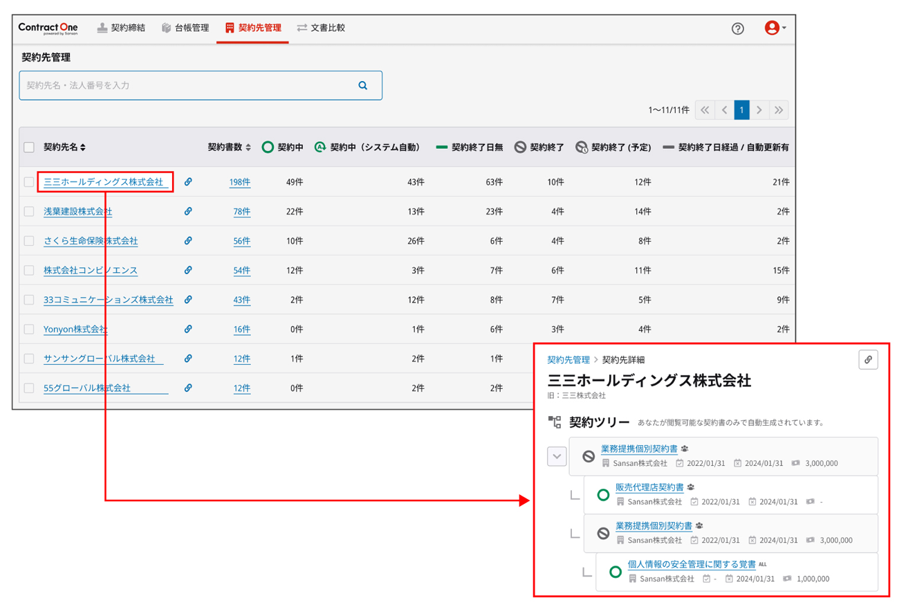 また企業名をクリックすると、該当企業と締結している契約書を親契約・子契約といった階層構造で表示できる詳細画面に遷移する。これにより、特定の企業に関する契約状況を網羅的かつ効率的に把握できる。社名の表記揺れや変更があっても、同一の企業として契約書を集約できる「名寄せ」の仕組みにより、企業単位での契約管理を実現。さらに、契約終了日や自動更新の有無といった情報をデータ化することで、契約状況を正確に判定し、状況別の契約書数を信頼性のあるデータとして可視化する。