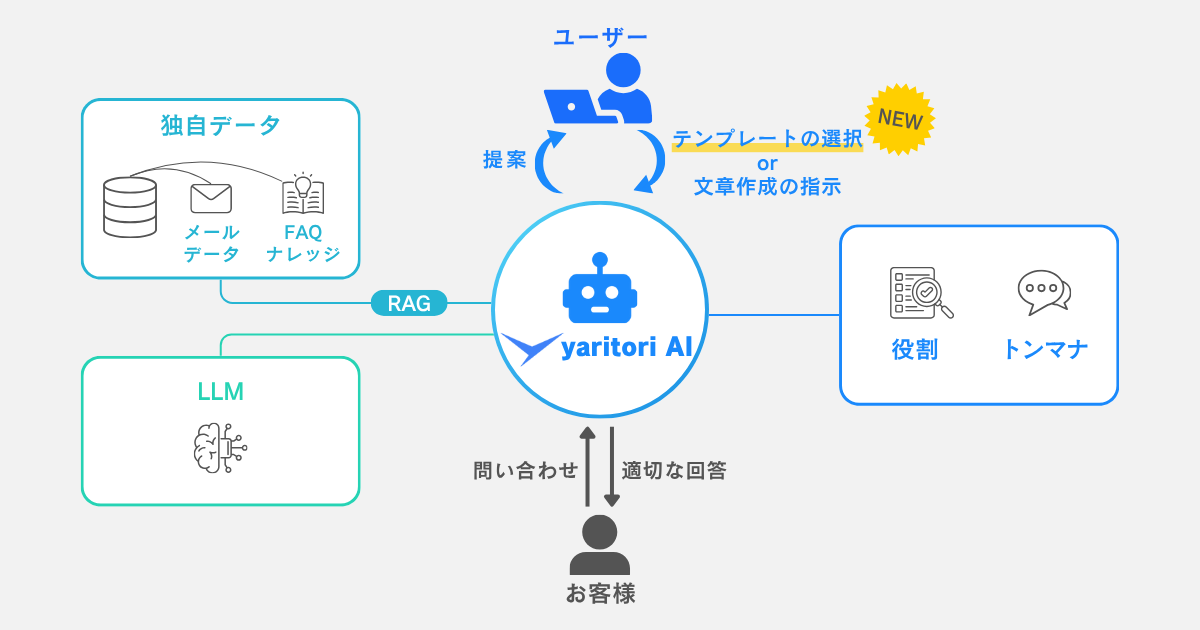 そこで同社は、2025年6月に過去のメール履歴を参照し、適切な回答文を瞬時に生成することができるAIエージェントyaritori AIをリリースした。リリース以降も、製品マニュアルなどのナレッジを学習する機能や、役割・トーン&マナーをカスタマイズできる機能など、継続的にアップデートを重ねており、今回新たに、AIエージェントがもっとも適した返信テンプレートをスピーディーに提案する新機能を追加した。