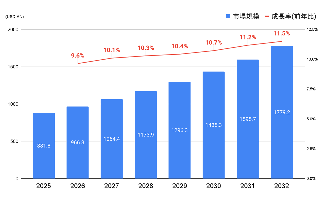 PRDUA Research & Media Private Limitedの調査レポート(※1)によると、リベート管理ソフトウェア市場は、米国およびアジア太平洋市場全体で2025年の約882百万ドルから2032年には約1,779百万ドル規模へと、年平均10.4%の成長率が予測されている。