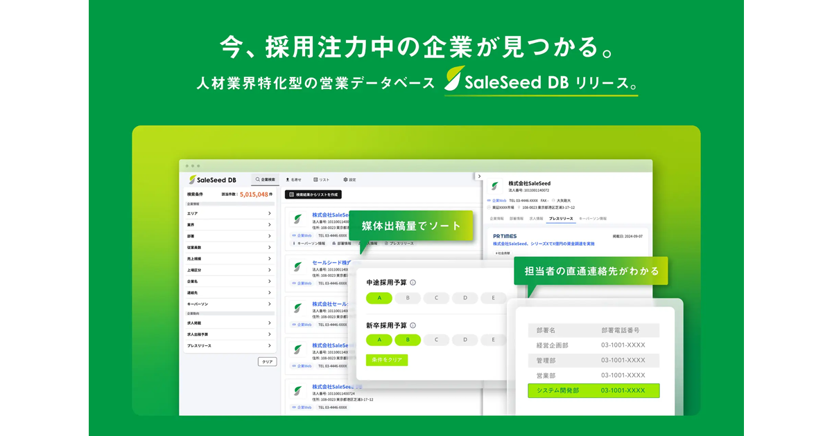 SaleSeedは、営業データベースSaleSeed DBの販売を開始。SaleSeed DBは、商材の意思決定に関わる担当者と直接つながることができる営業データベース。営業活動を商談数の向上や受注に結びつけるうえで、重要な要素のひとつが「アプローチリスト」である。これにより、直近の採用ニーズ(求人の有無や求人予算)、プレスリリースなどの企業動向をもとにリストの絞り込みが可能になる。