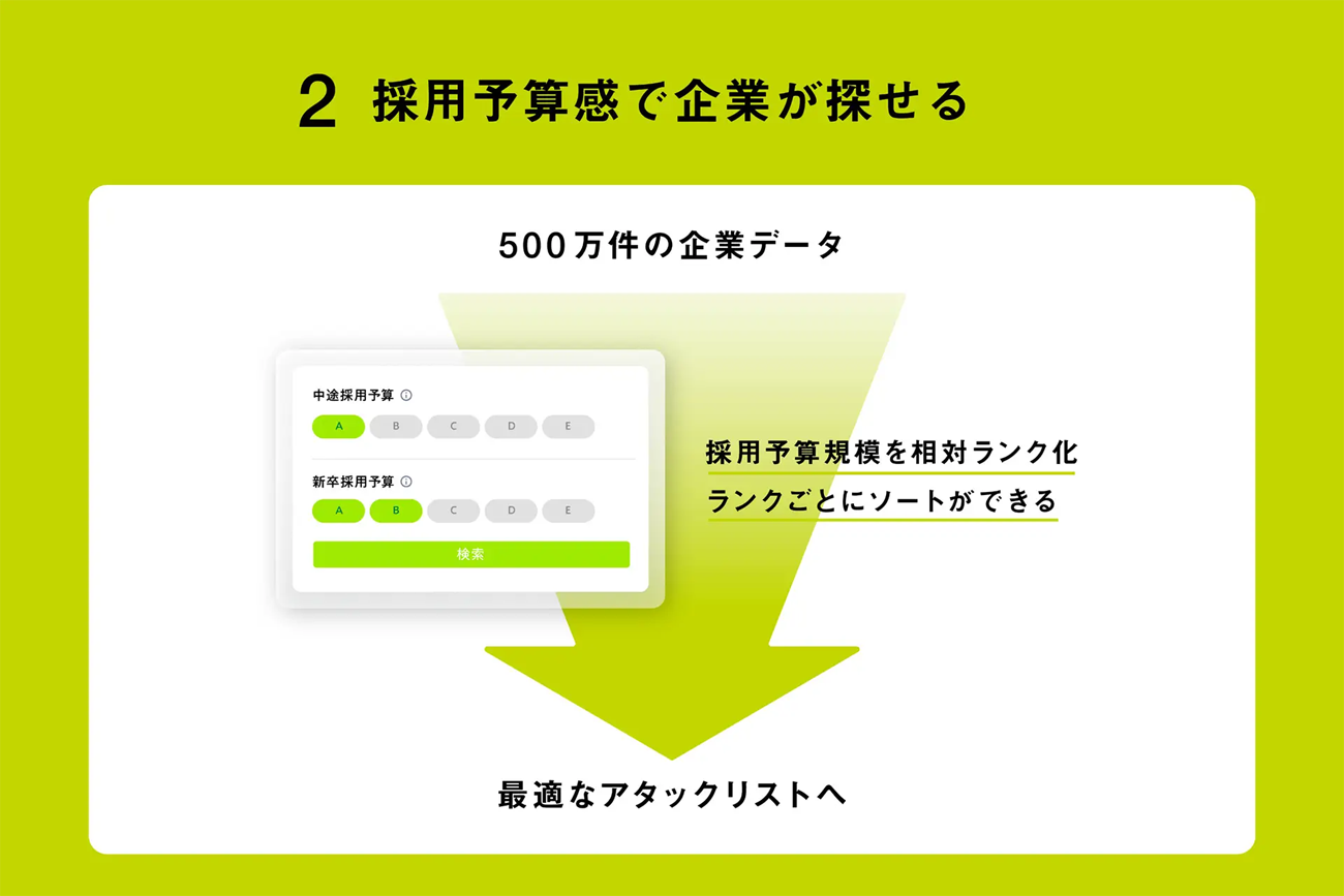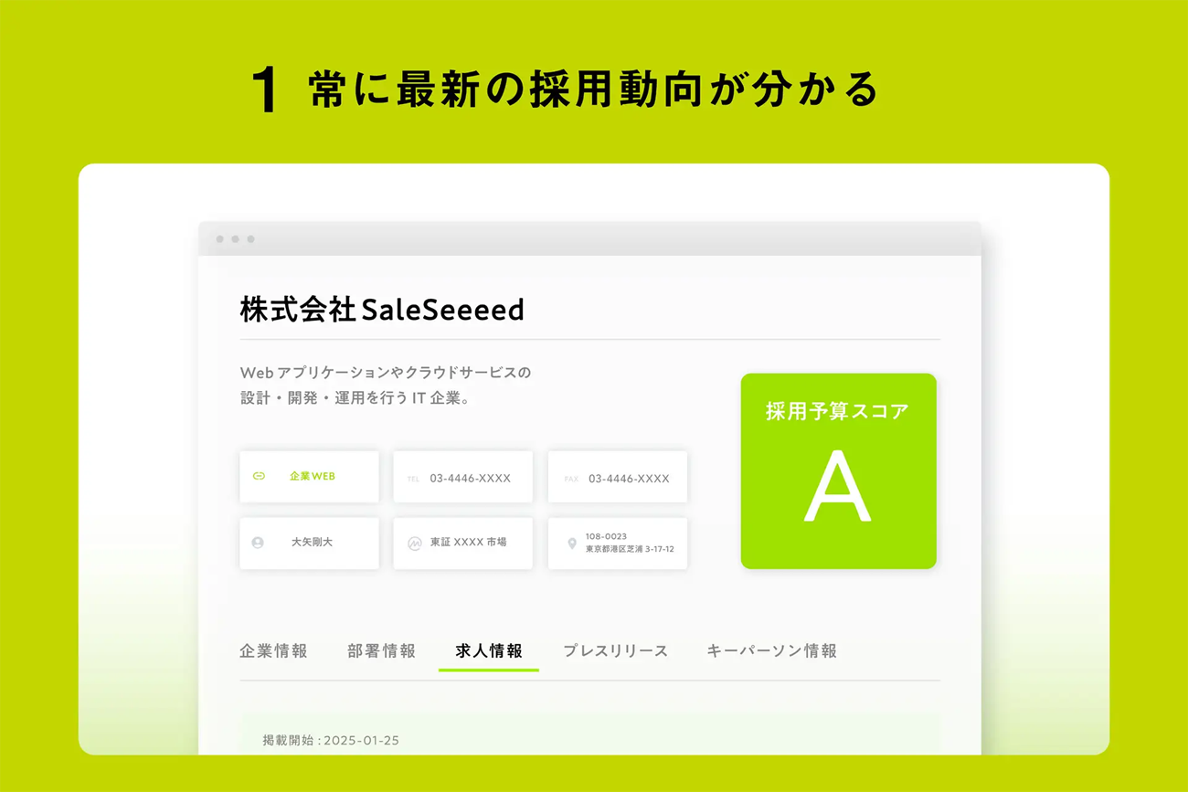 直近の採用ニーズやプレスリリースの情報を日次更新し、企業の動きを反映する。「今まさに採用に動いている=組織拡大・投資意欲が高い」企業を見極め、アプローチのタイミングを逃さず、商談化しやすい企業の抽出を支援する。