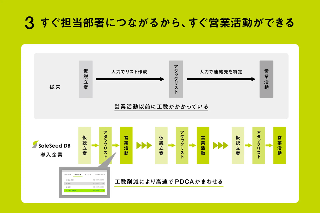 代表電話に架電しても担当者につながりづらいという課題に対し、効率的なアプローチができるようになり、商談獲得率の向上に寄与する。