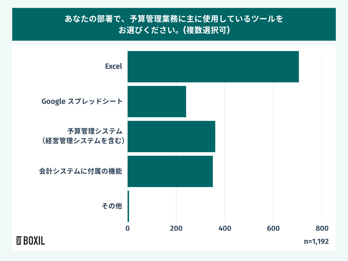 予算管理に携わる1,192人(「回答しない・わからない」と回答した545人は集計対象からはのぞく)に「予算管理業務で主に使用しているツール」を複数回答可で質問したところ、Excelが59.1%(705人)でもっとも多い結果となった。
