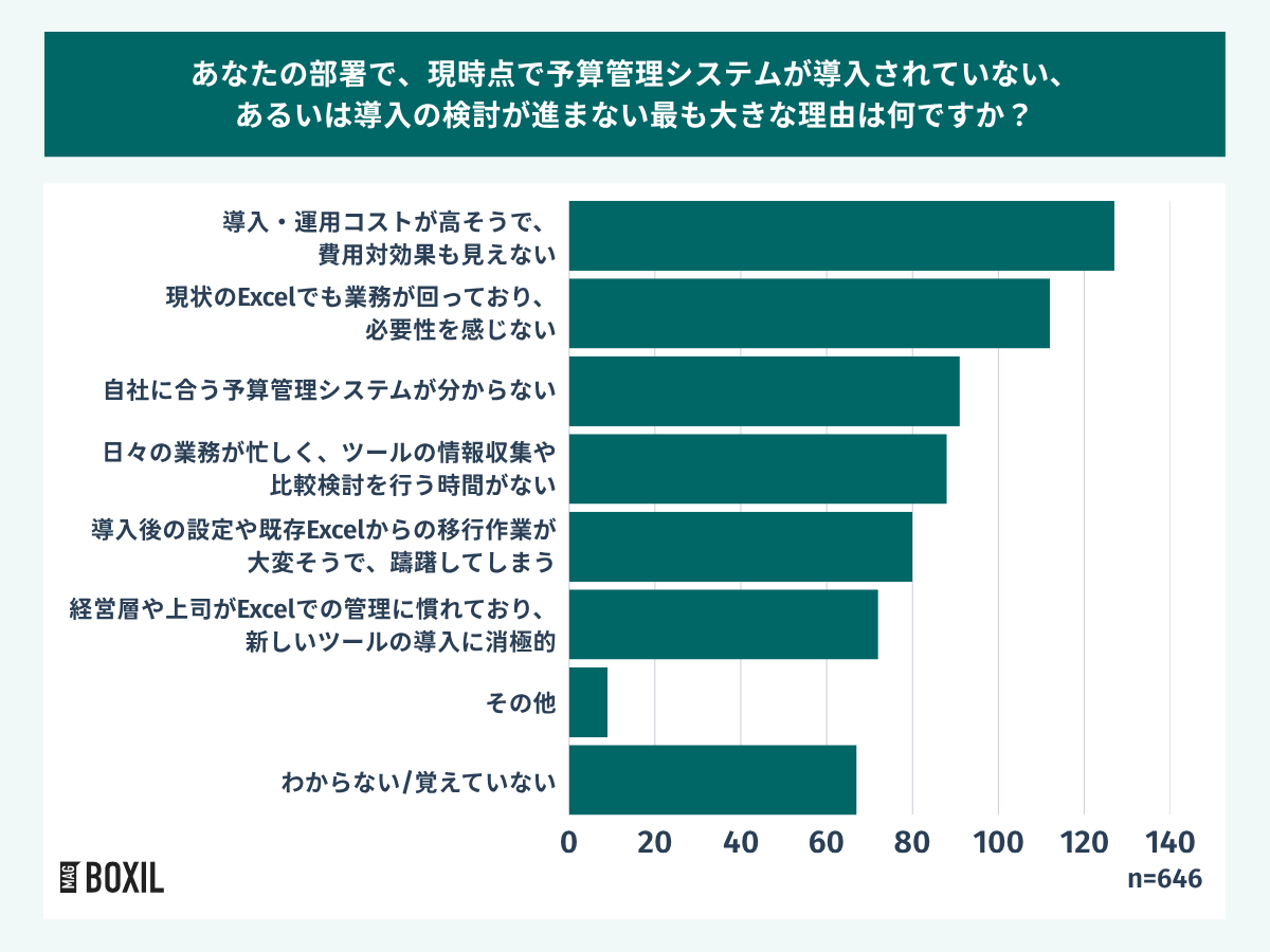Excelで予算管理を行っている646人に対して、予算管理システムの導入が進まない理由を質問したところ、「導入・運用コストが高そうで、費用対効果が見えない」が最も多く約20%(127人)だった。次いで、「現状のExcelでも業務が回っており、必要性を感じない」17.3%(112人)だった。