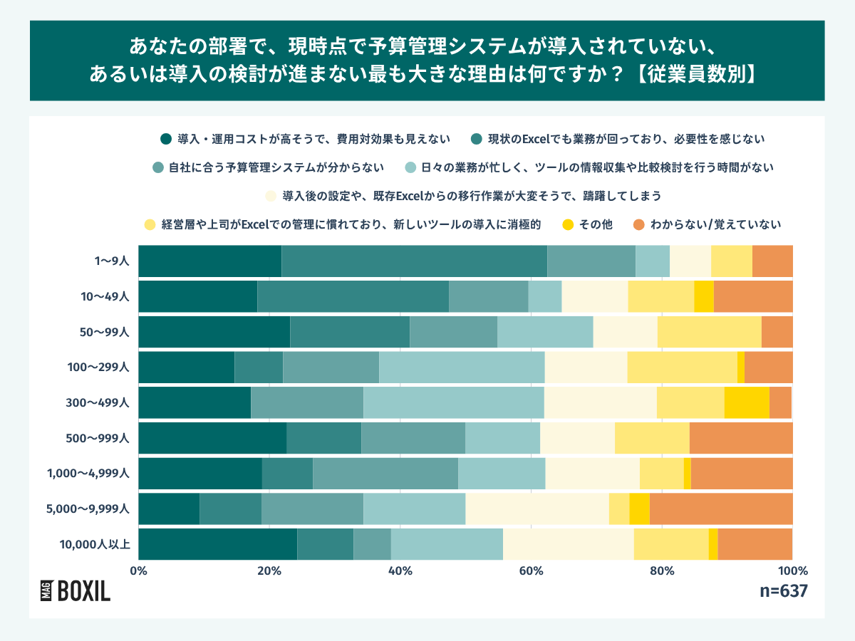 一方で「日々の業務が忙しく、ツールの情報収集や比較検討を行う時間がない」13.6%(88人)との回答もあり、とくに50人以上の規模の企業でその割合は増え、300〜499人規模の企業でとくに目立った。さらに「導入後の設定や既存Excelからの移行作業が大変そう」といった声も企業規模が大きくなるほど増える傾向が見られた。
