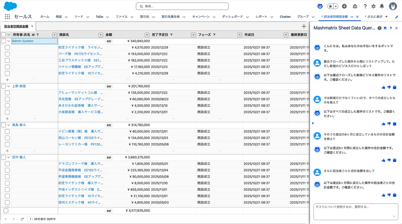 - 売上・請求管理:「今四半期の請求データから、未請求のレコードを担当別に集計して」と指示。抽出された一覧で、請求予定日を一括更新する。