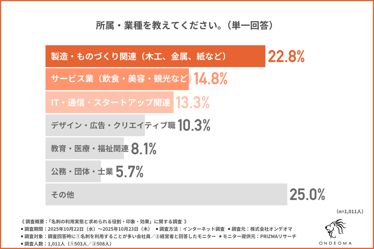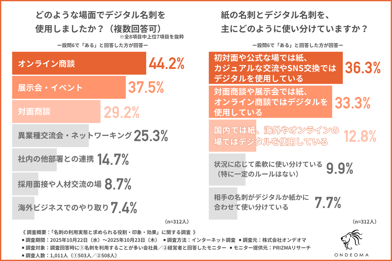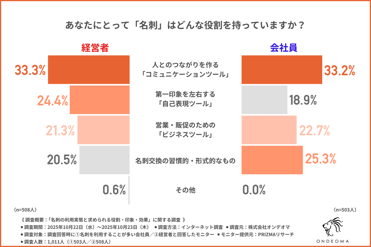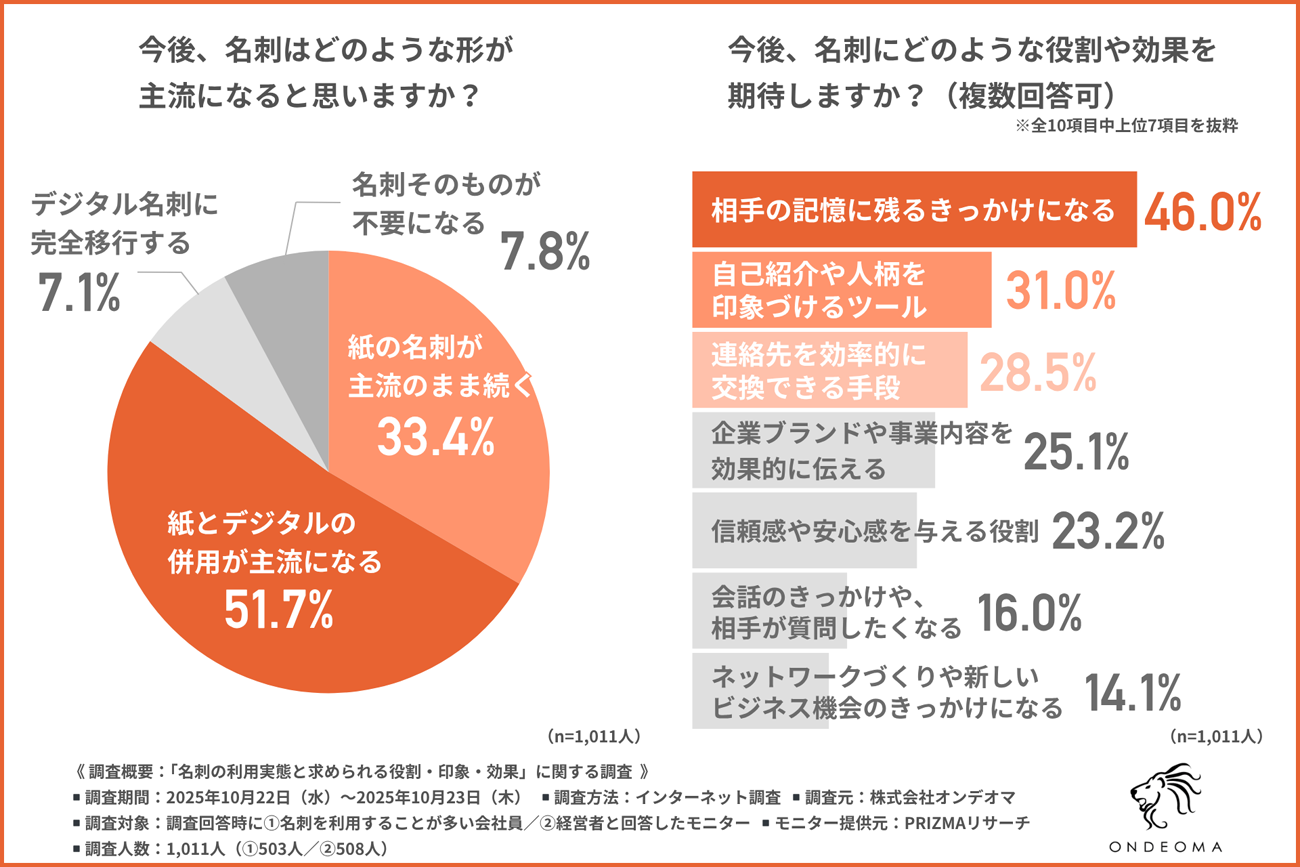 オンデオマは、名刺を使用する機会がある会社員を対象に、「名刺の利用実態と求められる役割・印象・効果」に関する調査を実施した。