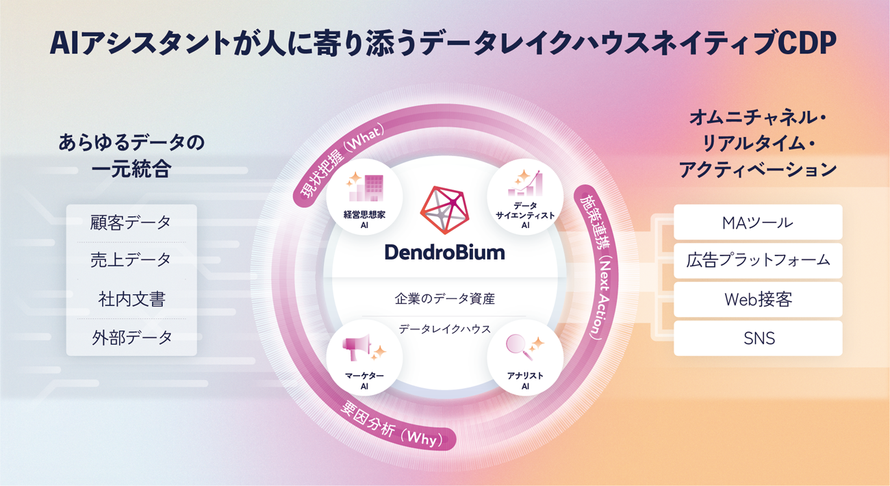 こうした背景から、データレイクハウスの柔軟性と信頼性を生かし、既存のデータ資産を最大限に活用できる「レイクハウスネイティブCDP」が注目されている。電通総研は、このような企業ニーズに応えるべく、企業のDX推進と効果的なデータ・AI活用を支援するサービスDendroBiumの提供に至った。