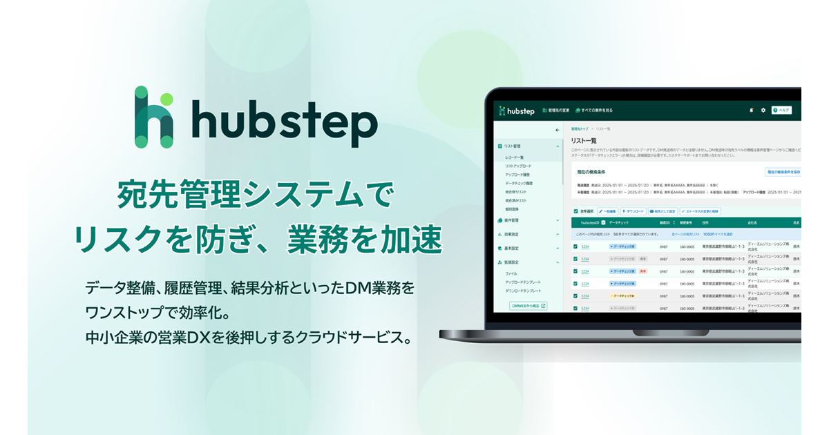 ディーエムソリューションズは、宛先データの整備・登録・発送履歴の管理を自動化するクラウドサービス「hubstep(ハブステップ)」を正式にリリースした。
