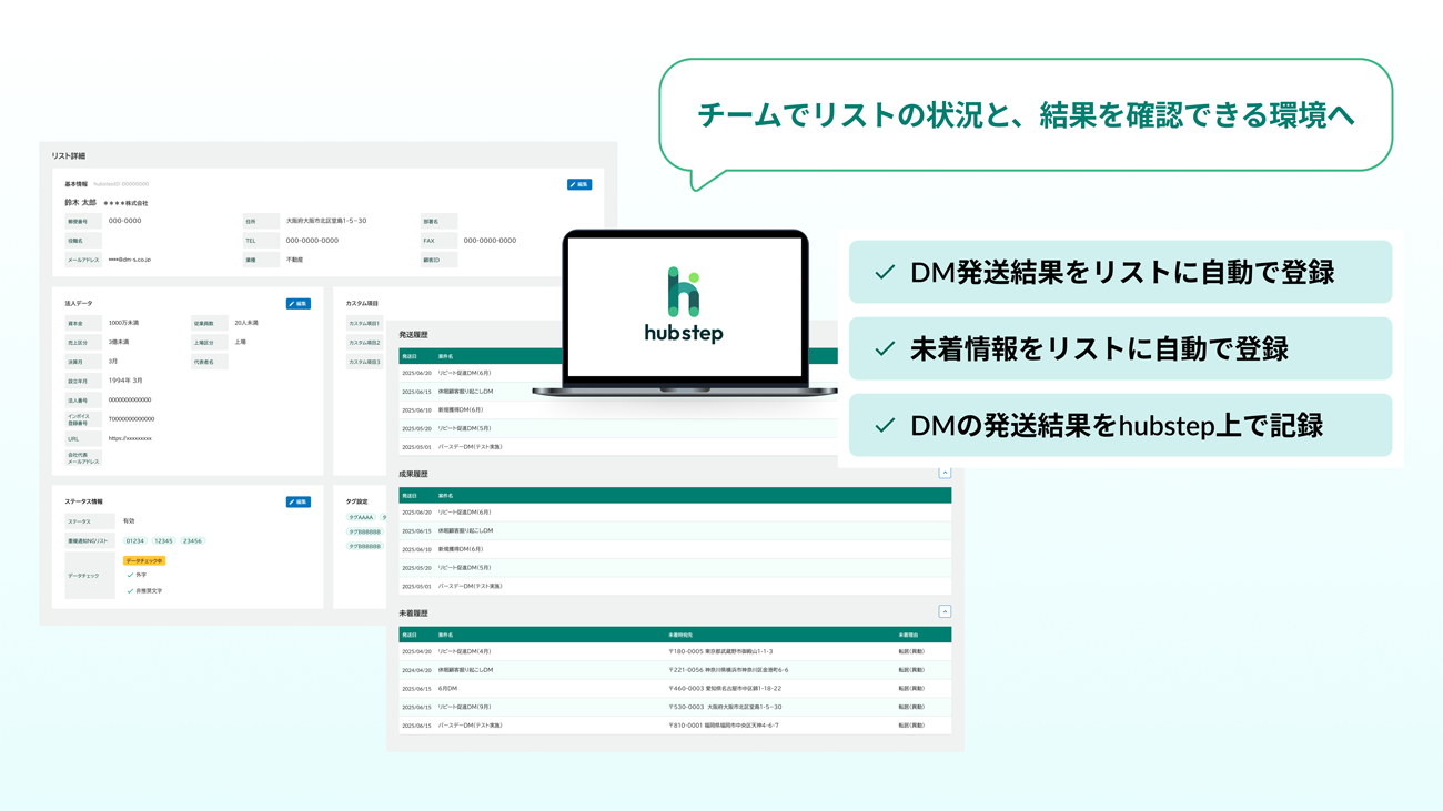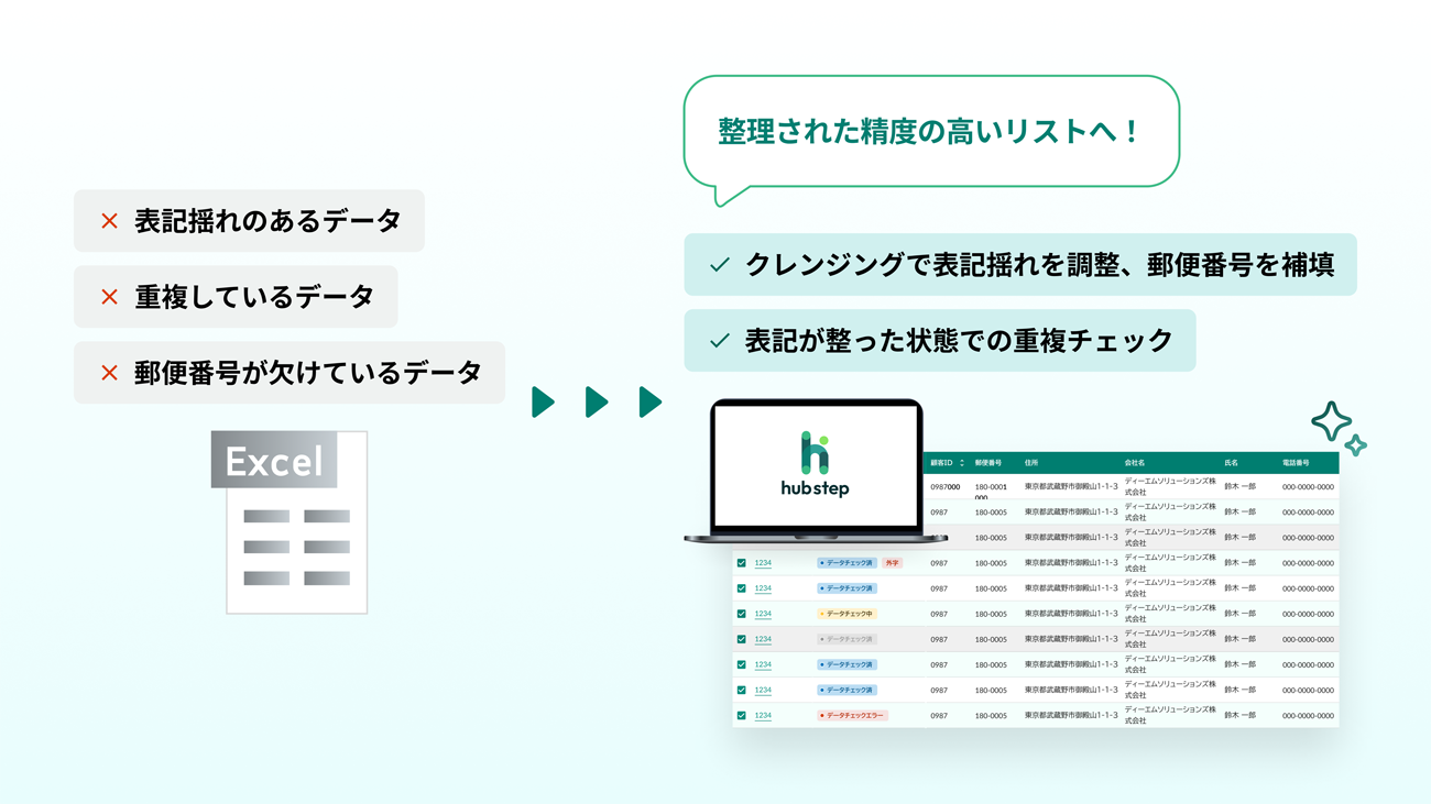 hubstepは、宛先データの整備から履歴登録までを自動化し、宛先管理業務を安全かつ効率的に運用できるクラウドサービス。