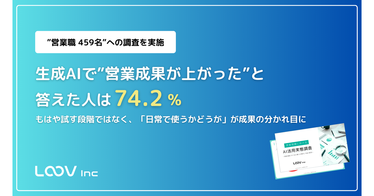 Video Agent「LOOV(ルーブ)」を展開するLOOVは、全国の企業に勤める営業担当者・営業責任者459名を対象に、「営業現場におけるAI活用実態調査」を実施した。